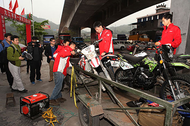 越野救护队到达雅安后卸车准备骑车前行