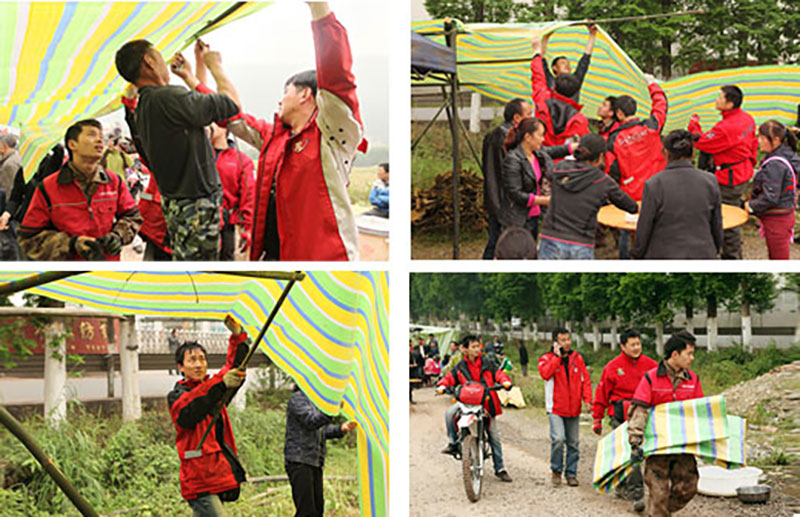 4月22日早上,全体救护队员集体赶往帐篷物资购买地购买物资。购买了10包彩条布(每包50米),雨衣、纸巾等灾区必备物资。此后,车队沿着雅安到芦山县城一线,开始挨村搜索,专门给灾民撘帐篷。说是帐篷,其实就是用油布做顶,就地取材做支架为灾民搭建临时的家。这是经济又实在的做法,灾民在这样的帐篷下,可以居住,也可以烧火做饭,比真正的救灾帐篷要实用得多。