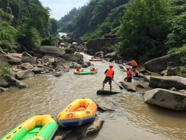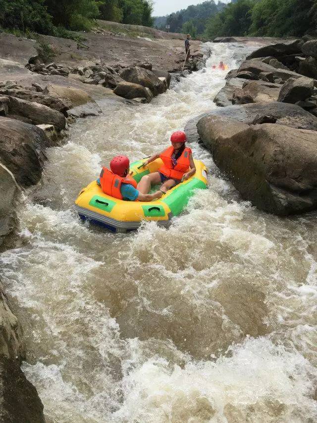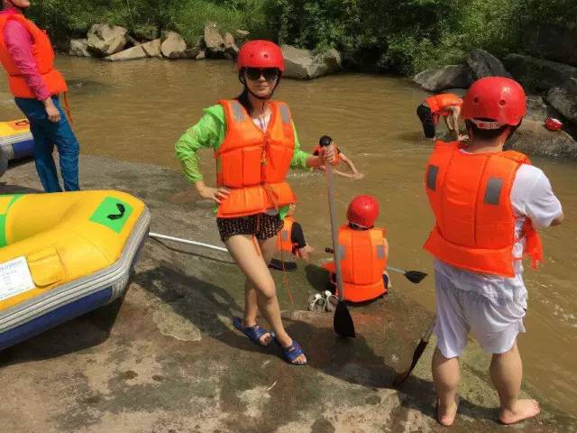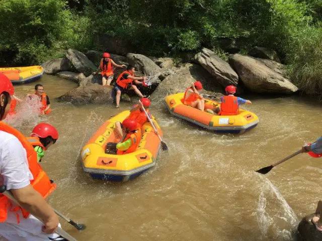 第二天,激情漂流开始了。组办方也是颇费心思,一男一女搭配乘坐一艏船,戴上安全帽,穿上救生衣,拿着船桨,出发了。最高18米的落差,一个急速俯冲,各种惊声尖叫层出不穷、连续不断。漂流途中更是刺激无比,一不小心就会遭遇埋伏,请多人拿着头盔、浆、瓢、盆各种武器,冰凉的河水铺面而来,泼水的人笑哈哈,被泼的人哇哇叫,被泼得分不清东南西北。各种泼水,各种翻船,轮番上演,大家玩得不亦乐乎。