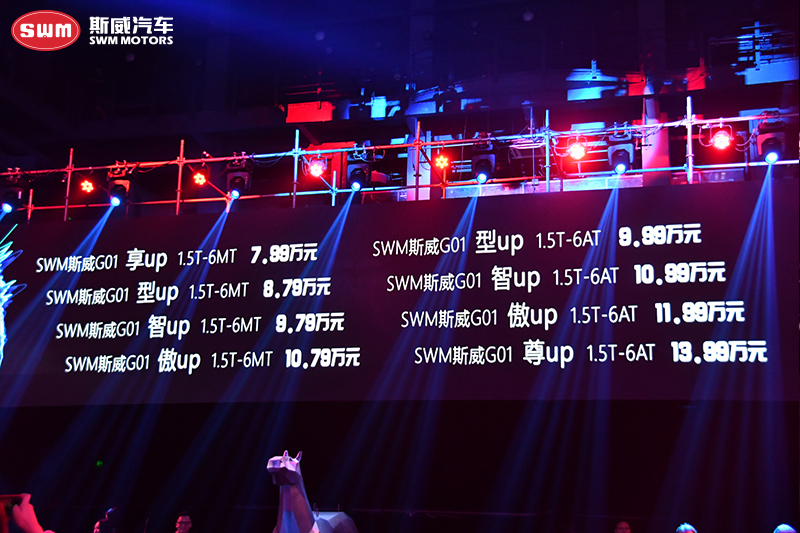 8月29日,SWM斯威汽车G01全球上市发布会在成都东郊记忆举办,斯威汽车全新战略车型——“型动·智能SUV”SWM斯威G01惊艳上市。新车由世界顶尖汽车造型设计师科沃斯领衔设计,国际质量大师高尔曼品质管控,共推出1.5T手动 享up、型up、智up、傲up和1.5T自动 型up、智up、傲up、尊up 8款车型,售价7.99-13.99万元。搭载1.5T 6MT/6AT动力组合,配备多项智能“黑科技”,斯威G01专为都市青年一族量身定制,将带来不一Young的“Go.智、Go.酷、Go.大、Go.爽”型智驾乘体验。