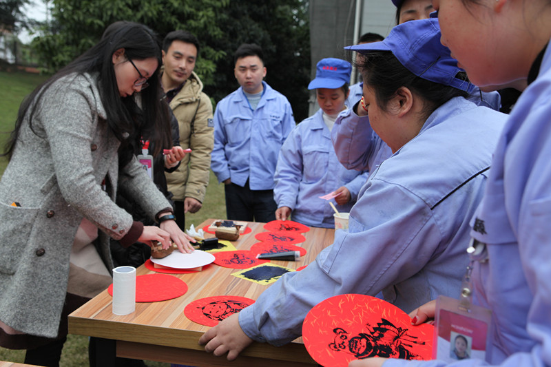 活动当天,三个基地都纷纷挂起了红色的灯笼和灯谜。家人们下班后,活动现场热闹非凡,大家纷纷聚集于灯谜处,三人一群、五人一堆讨论谜底,你一言、我一语地互相提示和讨论,猜对答案的家人们欢欢喜喜地领取一份现煮汤圆或年画等小礼品。