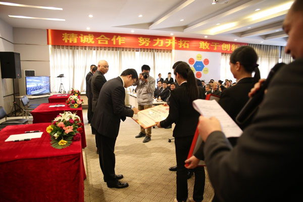 仪式中,龚大兴董事长为各子公司总经理授目标牌,并与其签署《2015年度经营目标责任书》。随后,各公司总经理直管人员也先后在目标牌上签字承诺,并与总经理签订目标责任书。签字完成后,各公司经营团队在总经理的带领下庄严宣誓,立志为达成2015年度经营目标而努力奋斗。